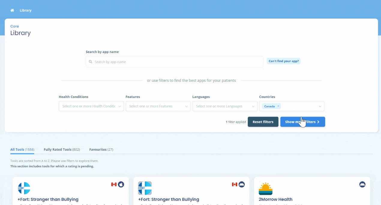 As of today, 104 tools in TherAppX Core mentioned they host data in Canada.