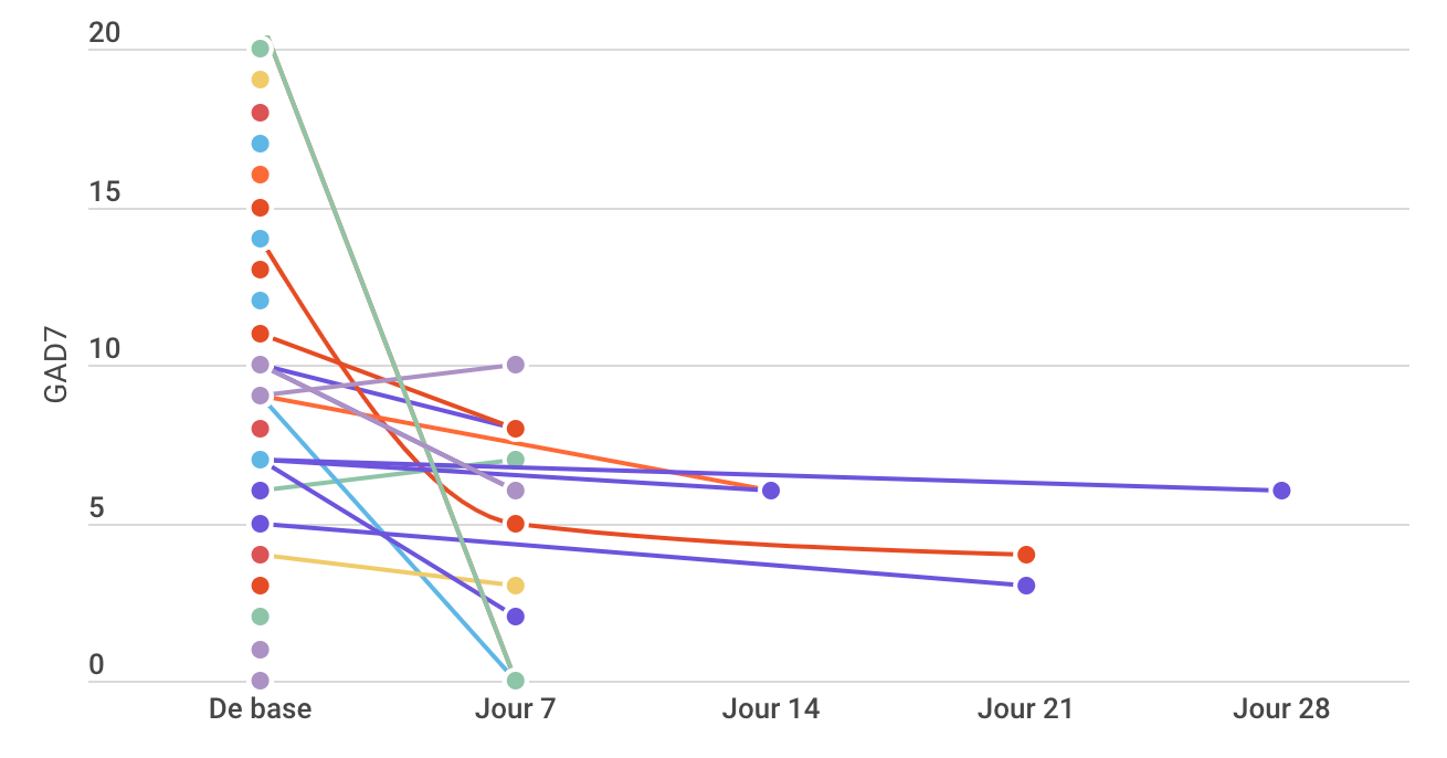 Parmi ceux qui nous ont fourni au moins une lecture après avoir été appariés à un outil, 171 patients (83,8%) ont amélioré leur niveau d’anxiété d’au moins un point sur l’échelle GAD-7, tandis que 53 patients (28,9%) ont réduit suffisamment leur score pour passer d’une anxiété sévère ou modérée à une forme d’anxiété plus légère.