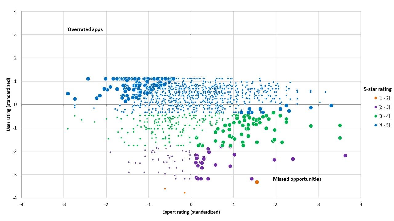 Il y a une relation très faible entre l'évaluation des experts et celle trouvée sur les app stores. Cela montre que la note 5 étoiles ne reflète pas les critères de qualité normalement utilisés par les experts. Cet écart ne signifie pas que l'évaluation produite par les consommateurs et consommatrices n'a aucune valeur, mais plutôt que choisir une application de santé uniquement sur la base de cet indice peut conduire à une décision sous-optimale. Ces décisions peuvent se traduire par le choix d'applications surévaluées (overrated apps), ou simplement par des opportunités manquées (missed opportunities). Dans la figure suivante, les points de plus grande taille correspondent aux applications dont l'évaluation des experts et la note 5 étoiles sont statistiquement très éloignées. Cela montre qu'environ 20% des applications de santé sont identifiées de cette manière.
