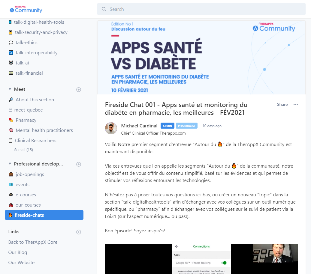 Via cette toute première entrevue des segments “Autour du 🔥” de la communauté, Alexandre Chagnon, Martin Payer et Michaël Cardinal, tous pharmaciens, s'entretiennent sur les différents outils numériques en santé disponibles pour le suivi du diabète de patients, jeunes et moins jeunes!