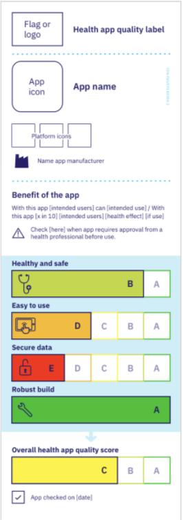 Lorsqu'un fabricant d'applications de santé effectue une évaluation ISO-82304-2, il reçoit une étiquette de qualité facile à comprendre (voir Figure 1). Cette étiquette s'inspire d'initiatives précédentes, telles que l’étiquette énergétique de l'Union Européenne utilisée dans plus de 50 pays hors d'Europe, le Nutriscore et l’étiquette des médicaments en vente libre de la FDA.