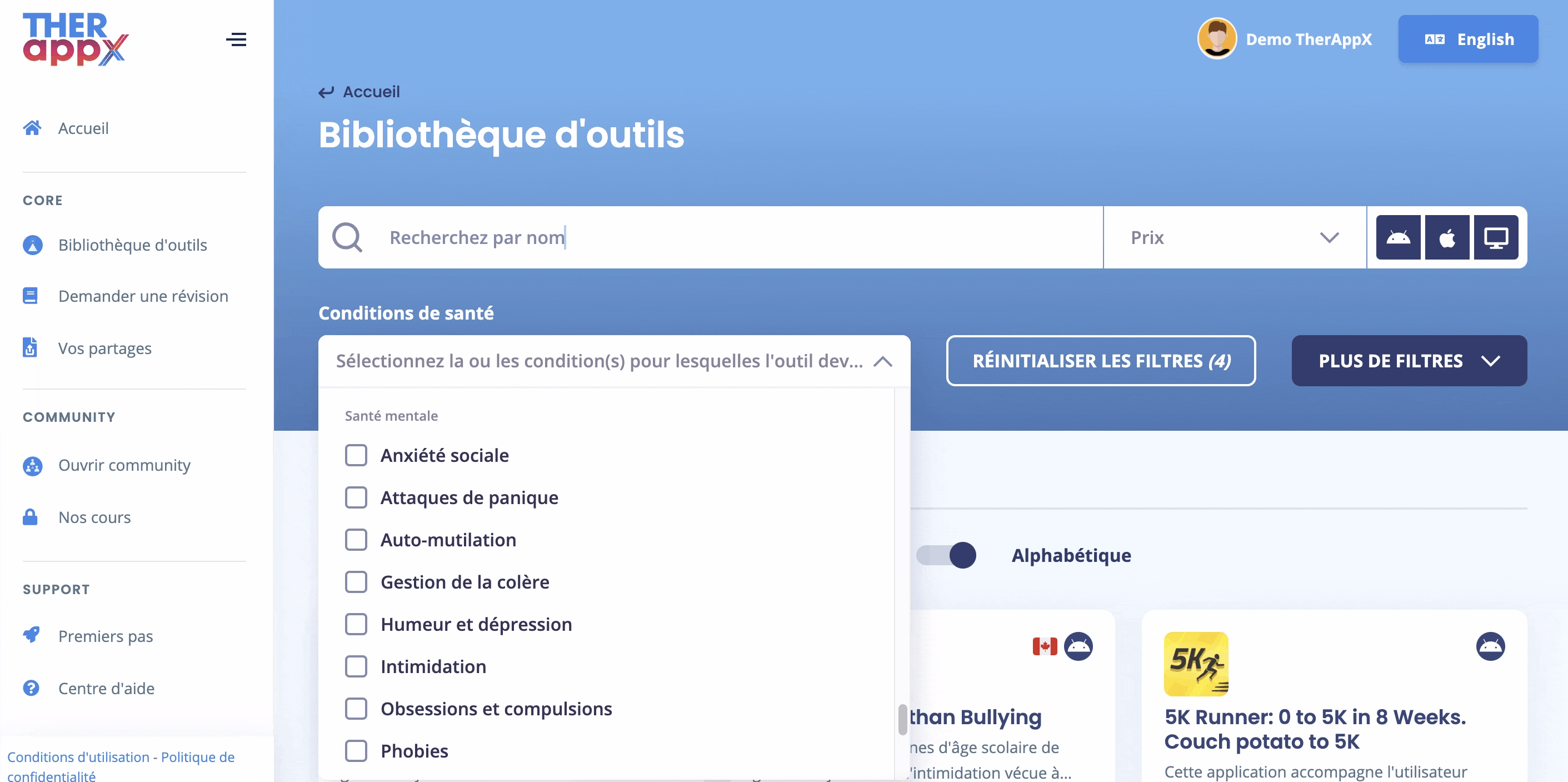 Cette analyse renseigne sur le fait que l'on peut bel et bien trouver des outils spécifiques à certaines thématiques. Bien qu'ils soient plus rares, ces outils ont une valeur aux yeux de patients dont certains besoins spécifiques sont à combler, comme par exemple le support aigüe lors d'une attaque de panique. Alors comment les trouver? Via la version gratuite de la librairie TherAppX Core, vous pouver filter les outils en fonction de 18 thématiques en santé mentale: