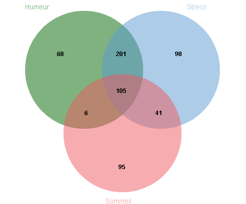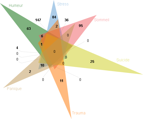 Ce diagramme de Venn comprend les 6 conditions de santé mentale les plus fréquentes dans la base de données, à savoir «Humeur et dépression», «Stress et anxiété», «Sommeil et insomnie», «Suicide», «Traumatisme et symptômes associés» et «Attaques de panique». Ceci montre que les outils qui traitent des conditions « suicide » et «traumatisme» partagent généralement peu de composantes pertinentes pour d'autres conditions. La condition «Attaques de panique» en revanche est très fréquemment ciblée aux côtés de «Stress et anxiété», ce qui n'est pas surprenant étant donné que le trouble panique est en fait un trouble anxieux.